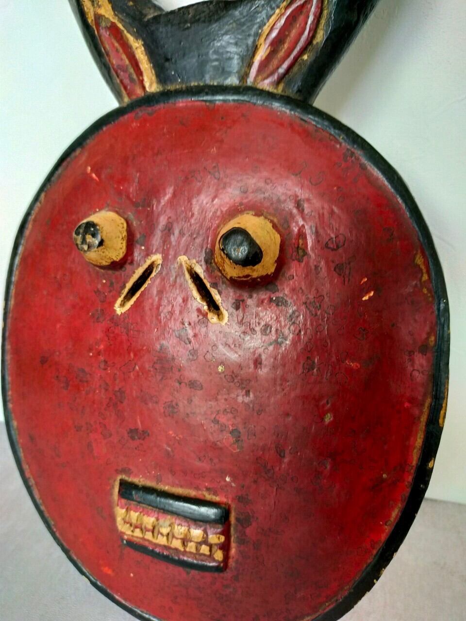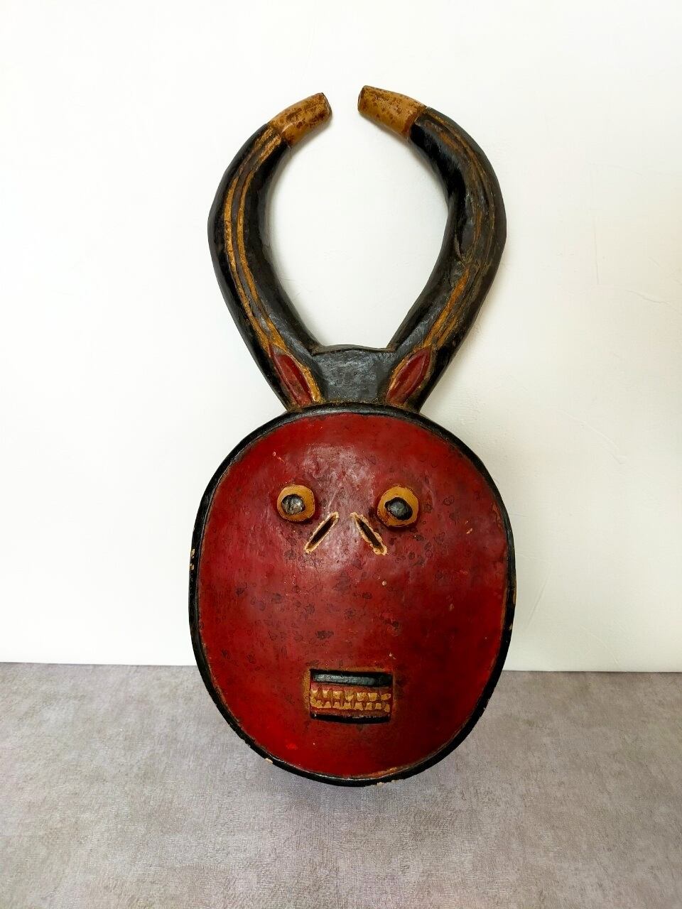 厳選ポイント:クールな目に剥き出した歯、アフリカ仮面らしい神秘的な顔立ちで圧倒的な存在感です。90年以上経ったものになります。
