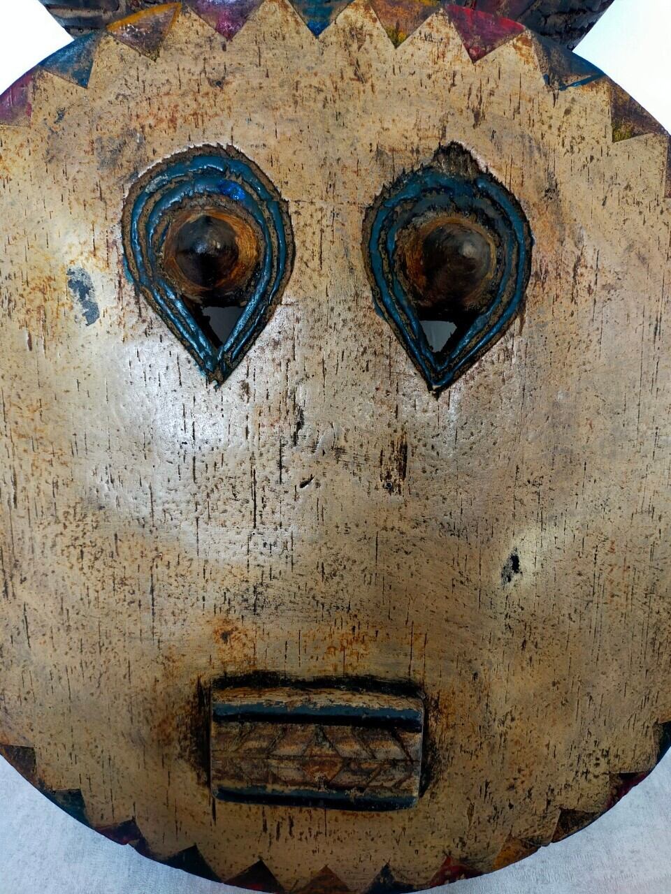 厳選ポイント:珍しい白のプレプレさん。元々黄色だったのではないかと思います。いい感じに色が抜けているのがまたポイント!目の縁が青色で顔の縁は珍しい3色。初めて見る色使いの仮面です。