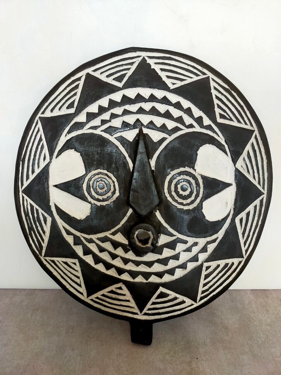 厳選ポイント:ボボ族(ブワ族)のサンマスクは色んなデザインがあり、どれも個性的で魅力的です。太陽仮面ですが、目元が三日月のような鳥にも見えるデザインに一目惚れしました^^