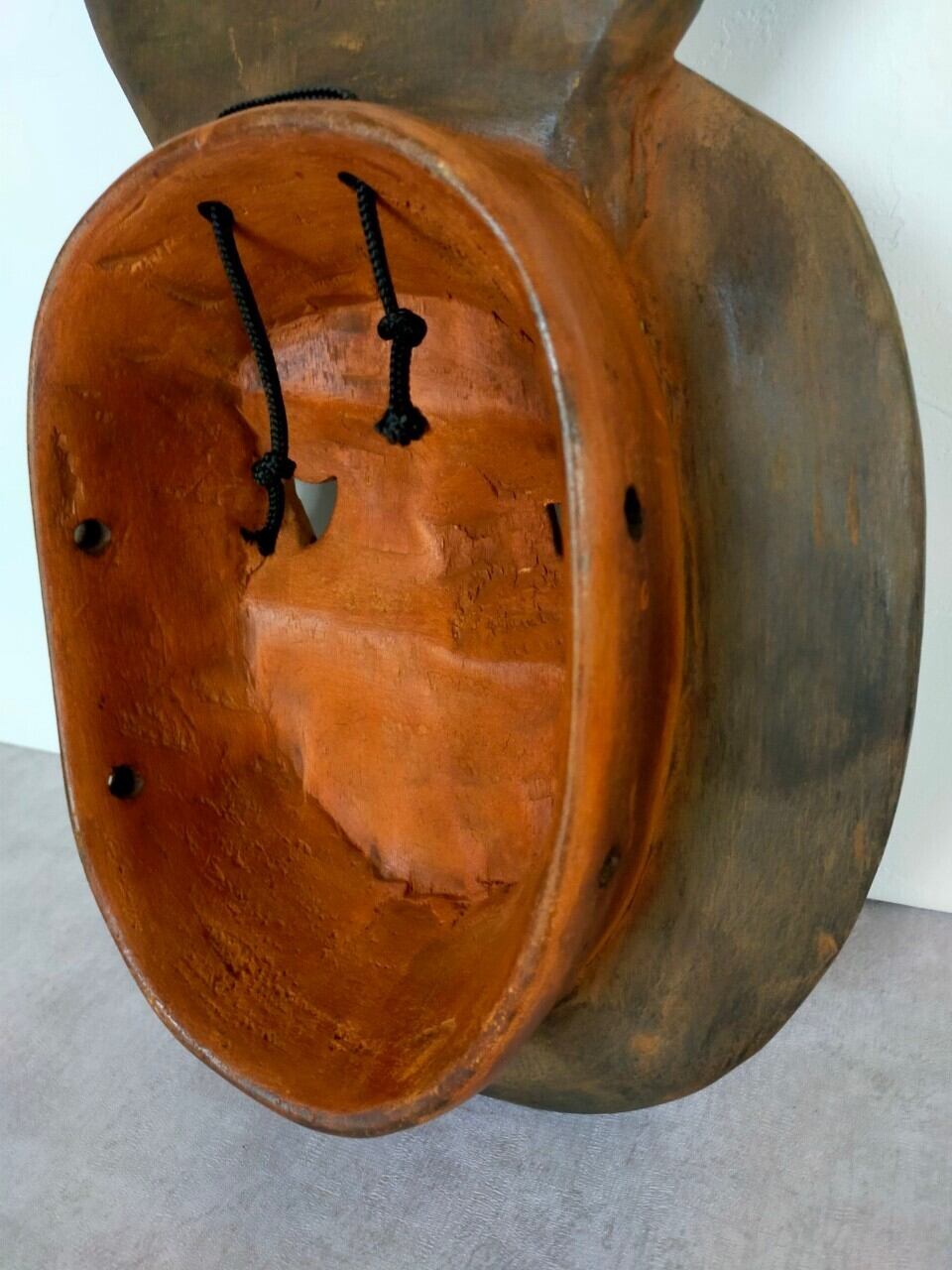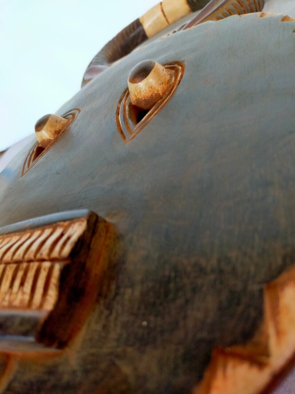 厳選ポイント:男前インテリアアイテムで人気のブラック仮面です。表面は良く磨かれており、ツルツルとした手触りです。少し褪せたようなブラックに、ダークブラウンの角の落ち着いた色合いがとても上品です。