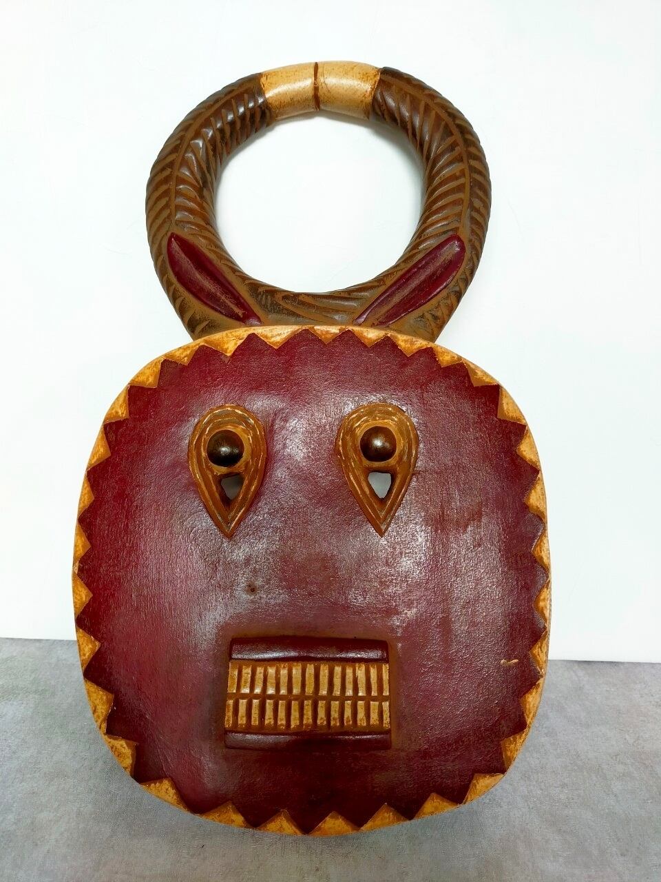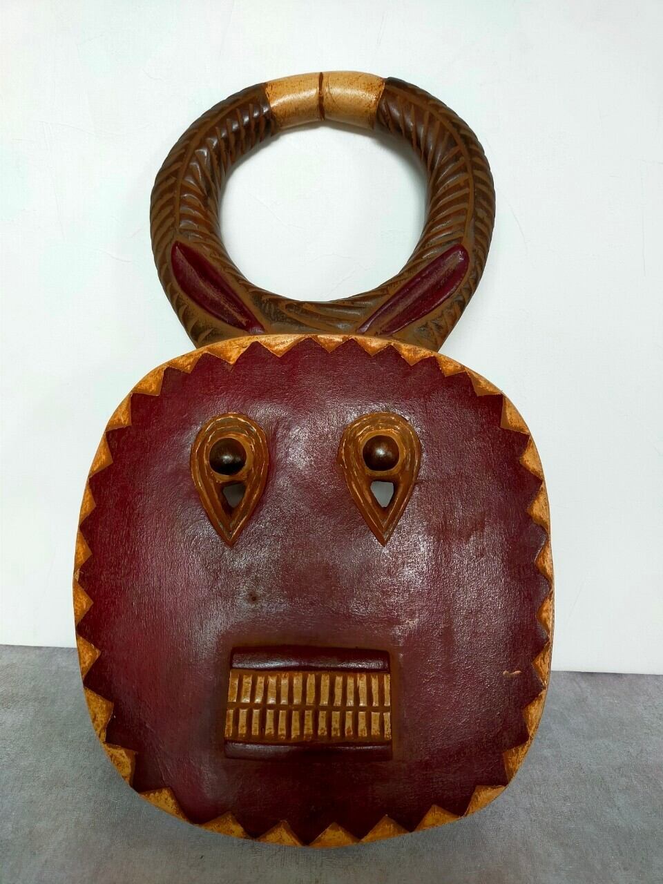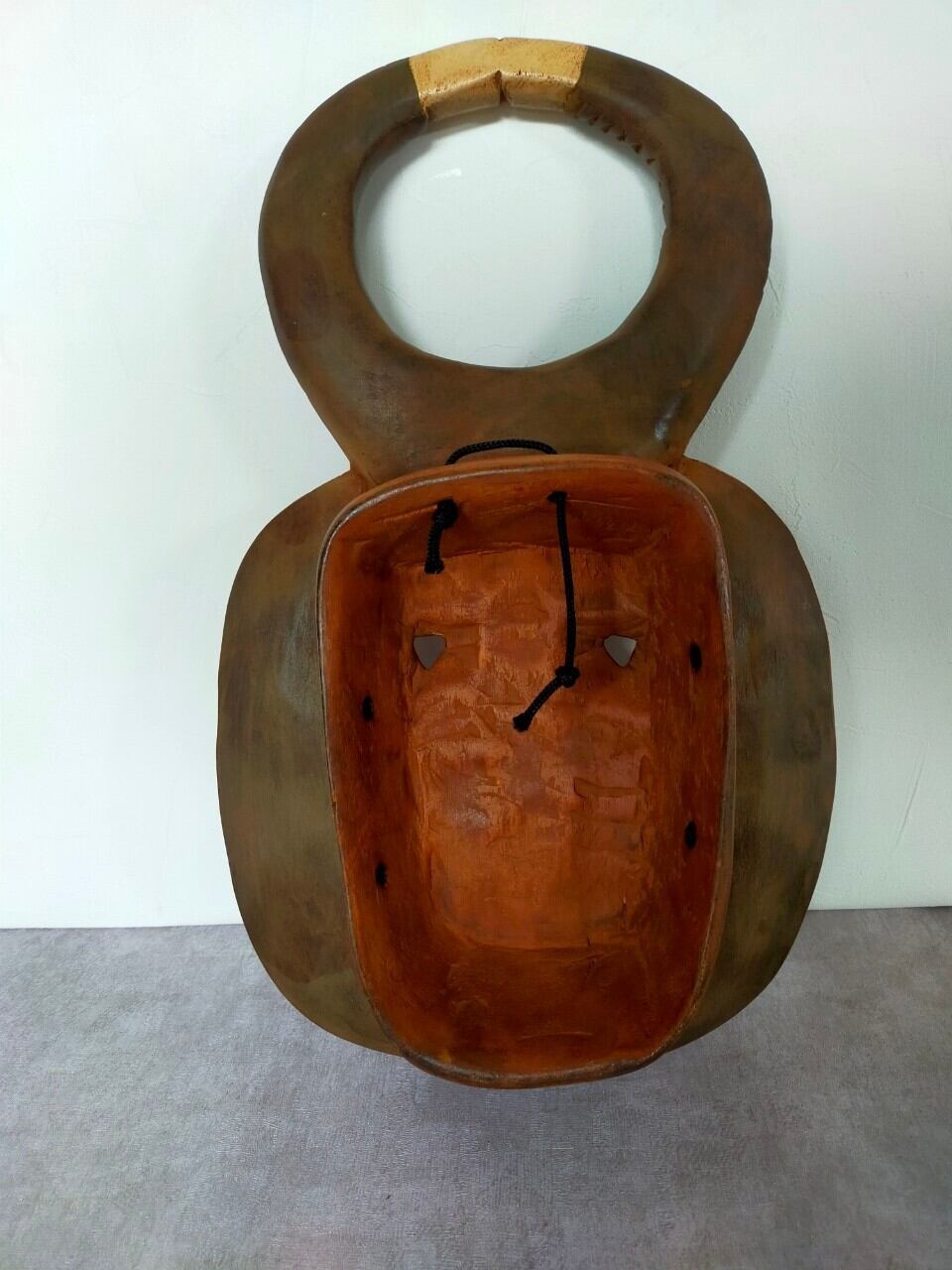 厳選ポイント:この子はウラガワが特に特徴的で、普通は丸形や人の顔型が多いのですがこの子は四角い入れ物のような形になっています。もちろんオモテも整った綺麗な歯に落ち着いた色合いが美しい仮面です。