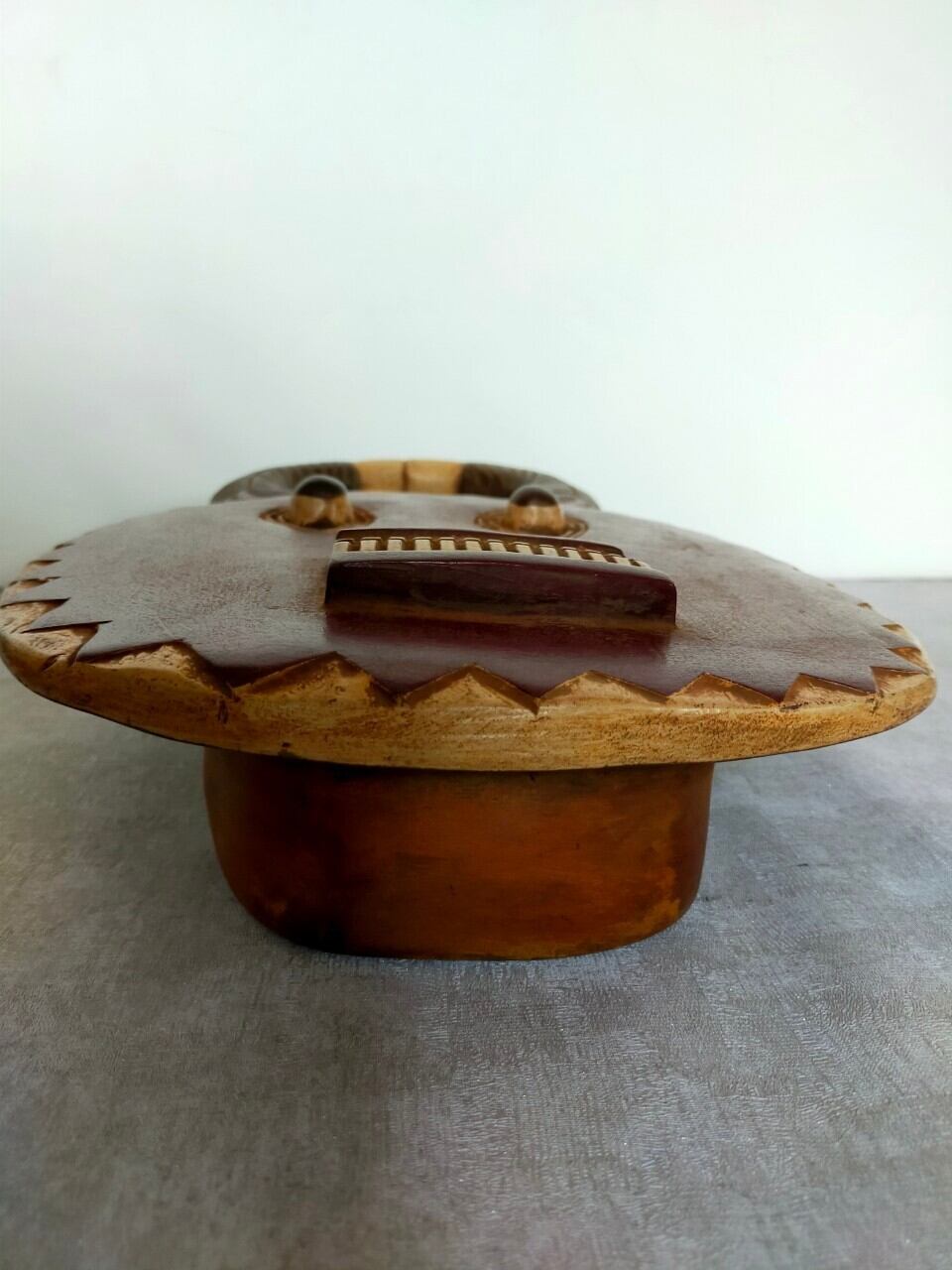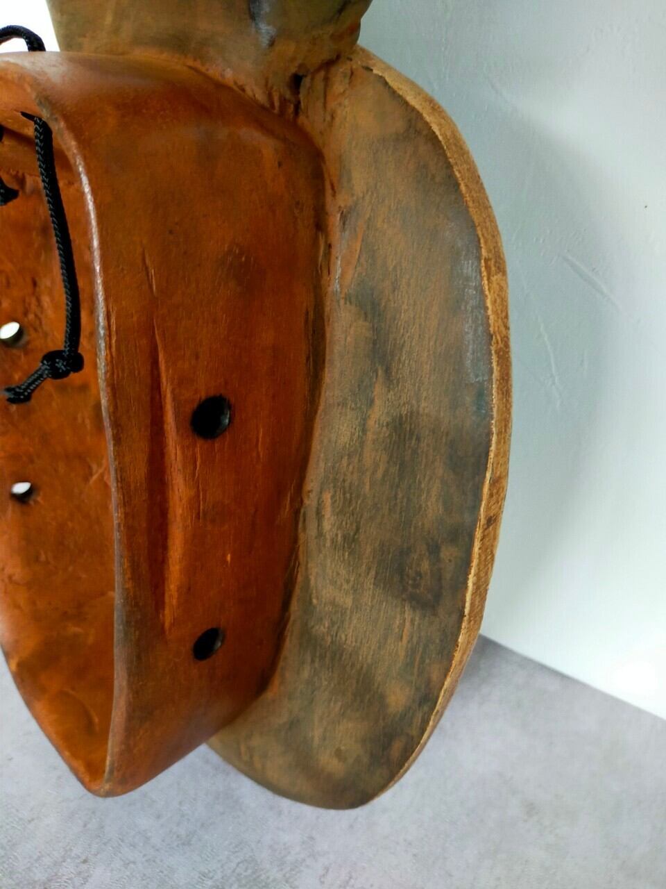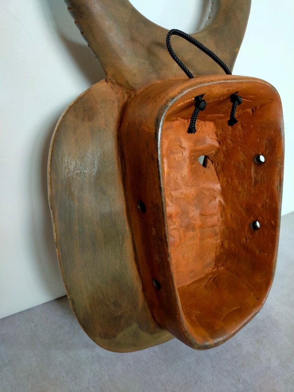 厳選ポイント:この子はウラガワが特に特徴的で、普通は丸形や人の顔型が多いのですがこの子は四角い入れ物のような形になっています。もちろんオモテも整った綺麗な歯に落ち着いた色合いが美しい仮面です。