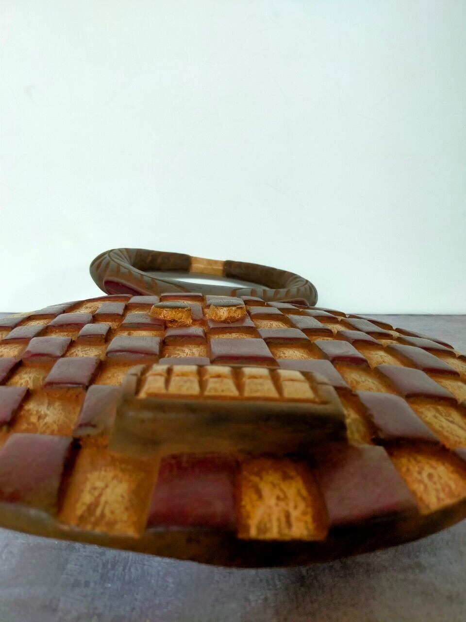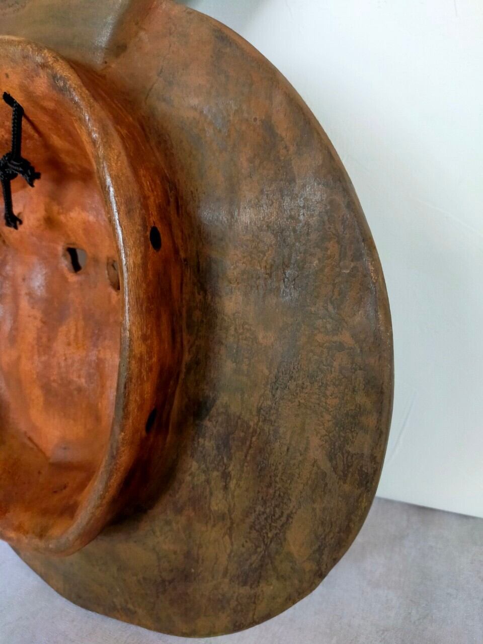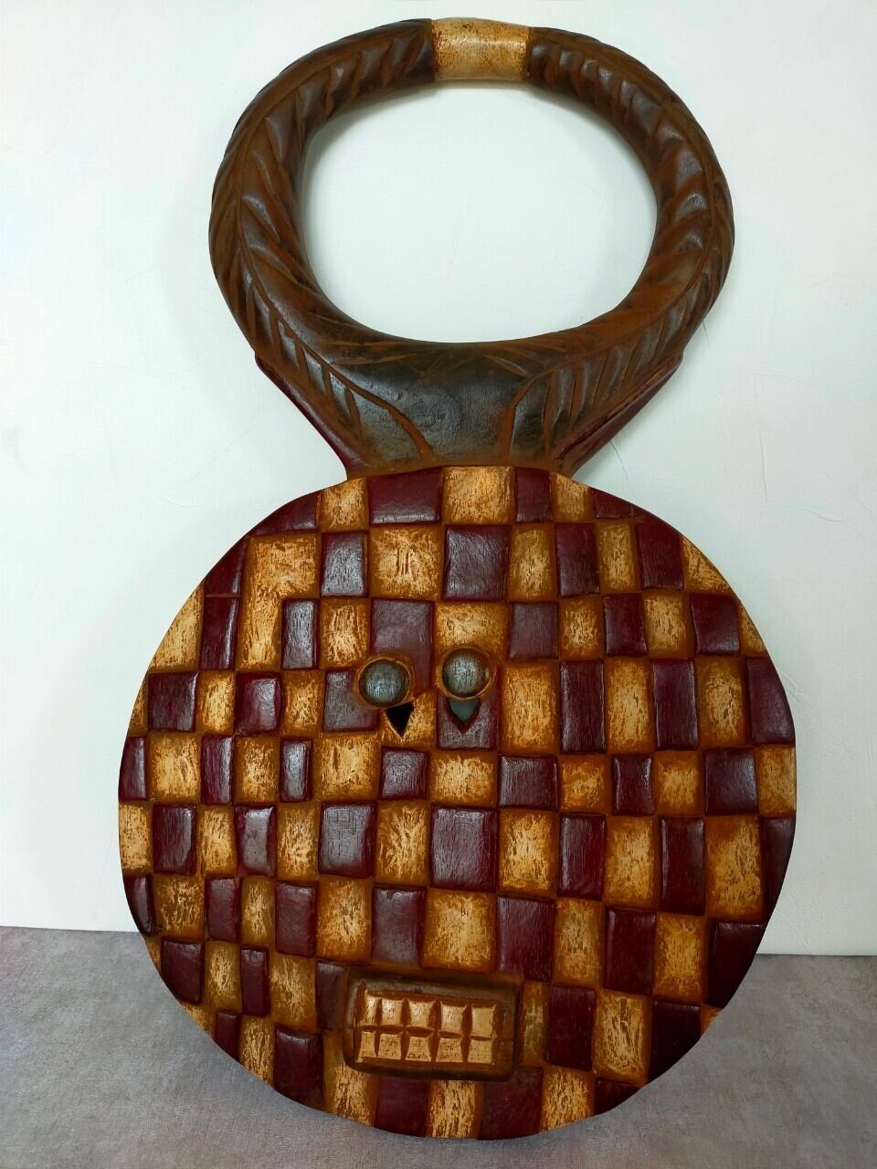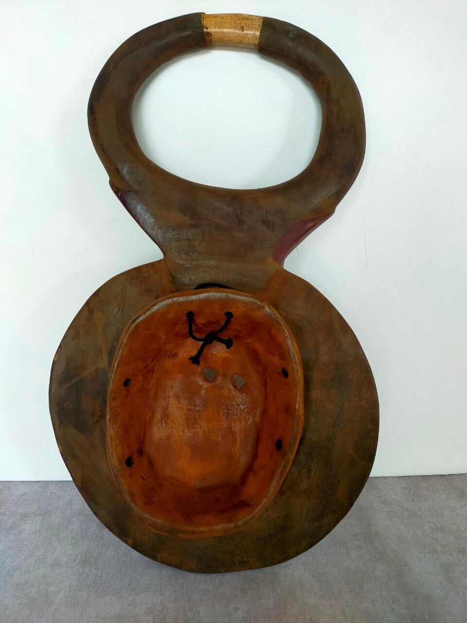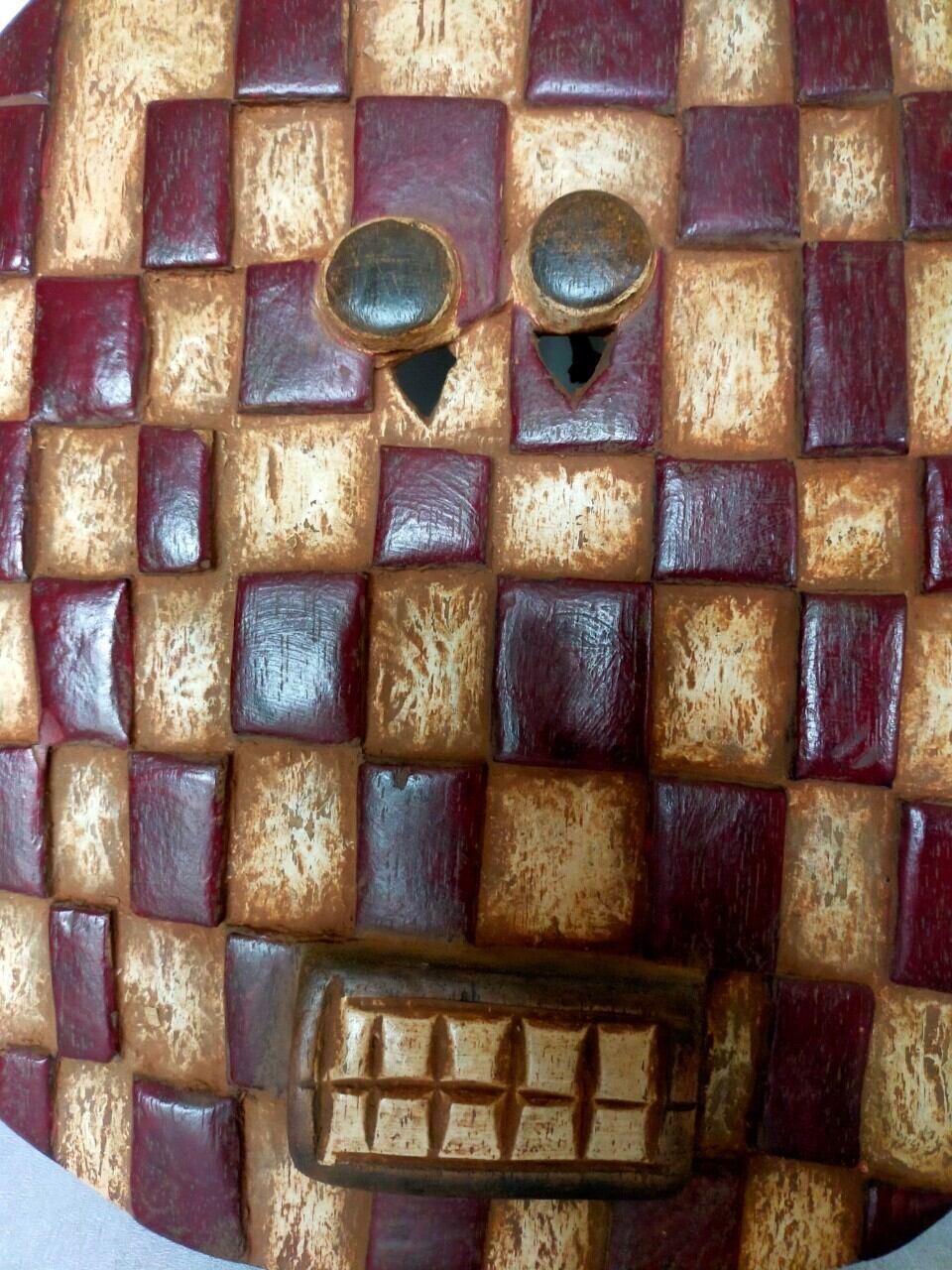 厳選ポイント:すごく個性的な顔に、白と茶のコンビネーションがお洒落です。茶色の部分はツルツルで白い部分は少し荒くほんのり色づいた赤土色が美しい1970年生まれの仮面です。